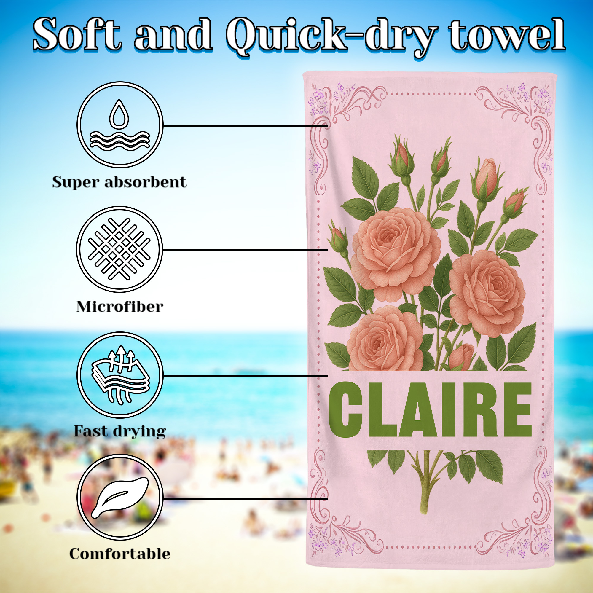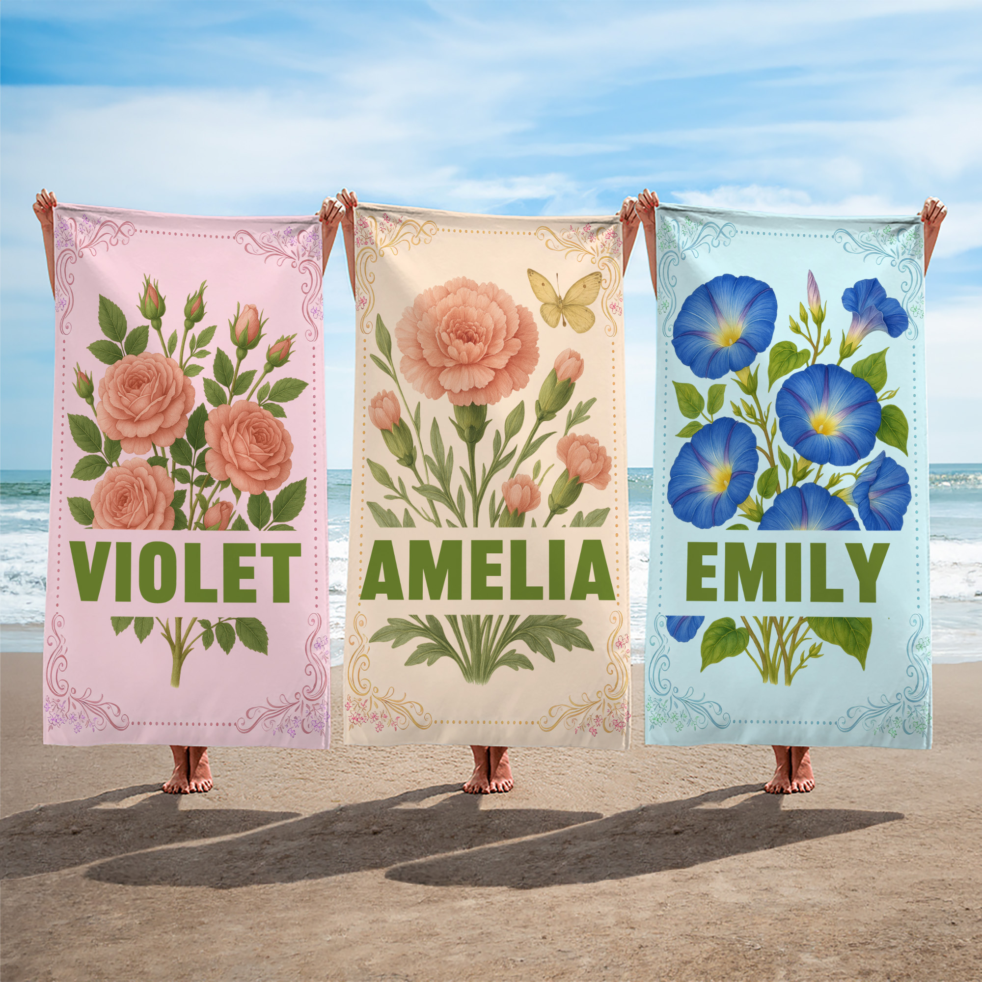Personalized Name Birth Flower Beach Towel, Quick Dry Microfiber Bath Towel, Vacation/Beach/Pool Party Favor, Gift for Her/Mom/Friends/Bridesmaids